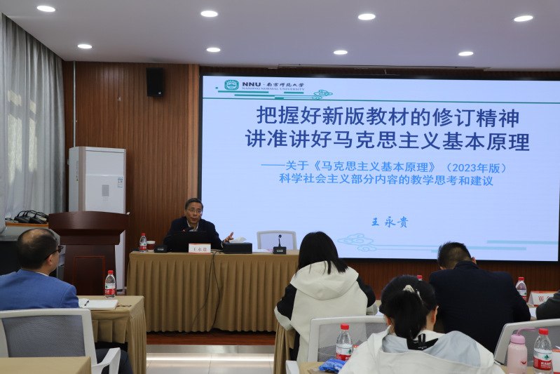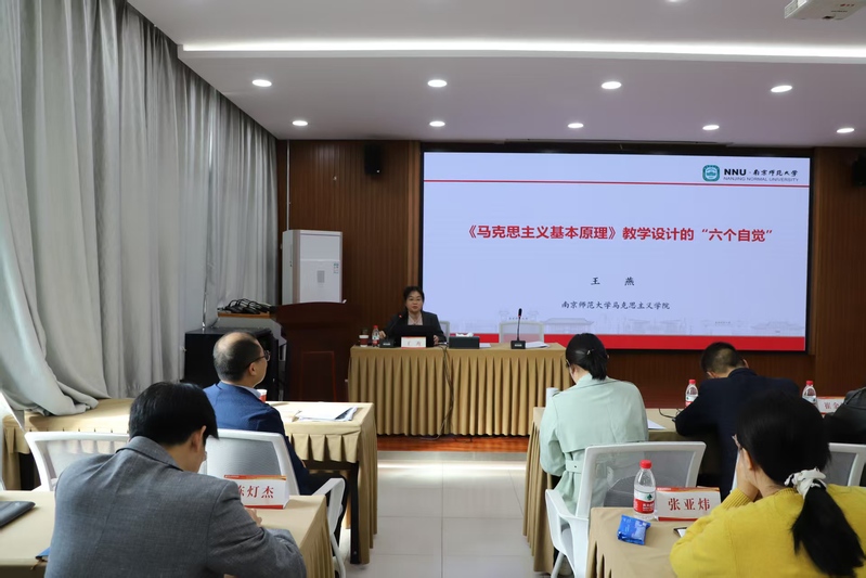 在专家报告环节,教育部长江学者、南京师范大学马克思主义学院王永贵教授以“把握好新版教材的修订精神 讲准讲好马克思主义基本原理”为题,系统阐述了教材修订概况、教学总体要求及教学内容对比分析和把握好科学社会主义部分教学的重难点,并就推动新版教材教学理念、思路及教学创新提出建议,为教师们讲准、讲活“原理”课提供了一把“金钥匙”。中国矿业大学马克思主义学院曹洪军教授作了题为“以强化教学学术研究提升思政课教学质量——教育教学改革课题申报心得交流”的报告,结合自身申报教育部课题经历,分享了课题选题和申报书撰写的经验,为思政课教师实现教学与科研的良性互动、协同发展提供了有效助力。南京师范大学马克思主义学院王燕教授以“《马克思主义基本原理》教学设计的‘六个自觉’”为题,结合在全国思政课教学展示活动中获一等奖的实践经验,从学情分析、相邻学段衔接、能力培养等角度阐释了教学设计的基本原则与实施策略,为参训教师提供了重要指导和参考。