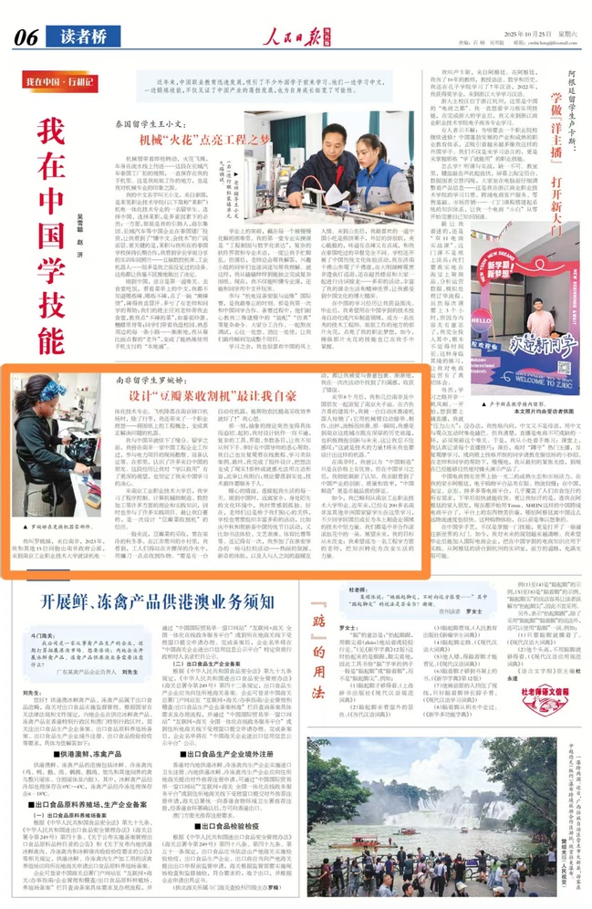 10月25日,人民日报海外版聚焦跨国教育合作,《我在中国学技能》专版报道了我校南非留学生罗婉姊的在校成长故事。这位怀揣工程梦想的青年,通过中南教育合作项目跨越山海,在中国实现了从理论到实践的跨越。