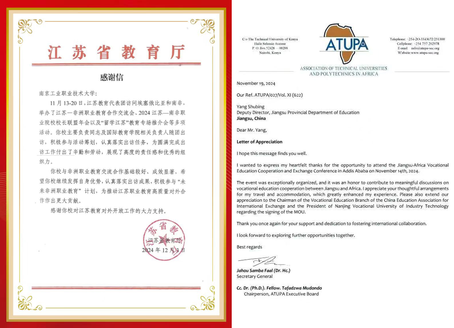 自2018年起,我校与南非高等教育与培训部、南非地方政府培训署展开合作,积极开展南非学生来华学习实习项目,接收来自南非的3批次共128名学生。2023年,在江苏省教育厅、江苏省人民政府外事办公室和南非高等教育和培训部的指导下,我校牵头成立“江苏—南非职业院校校长联盟”。该联盟汇聚了江苏11所高校和南非8所高校,为中南两国职业院校搭建了重要的交流平台。2024年,“江苏—非洲职业教育合作交流会”在埃塞俄比亚首都亚的斯亚贝巴顺利举办。会上,我校南非分校正式揭牌成立,并与非洲技术与应用型大学与学院协会签署中非职教合作备忘录、与埃塞俄比亚联邦职业技术培训学院签署新能源汽车产业职业培训合作备忘录。同年,江苏—南非职业院校校长联盟年会暨“留学江苏”教育展在南非比勒陀利亚成功举办,“未来非洲计划青年营”活动在我校开营。今年,中国—南非国际奖学金项目启动仪式暨2025级开学典礼在我校圆满举行,共有200余名南非留学生获得中国-南非国际奖学金来华学习。为此,江苏省教育厅、非洲技术与应用型大学和学院协会以及南非高教部地方政府培训署专门致函表示感谢。