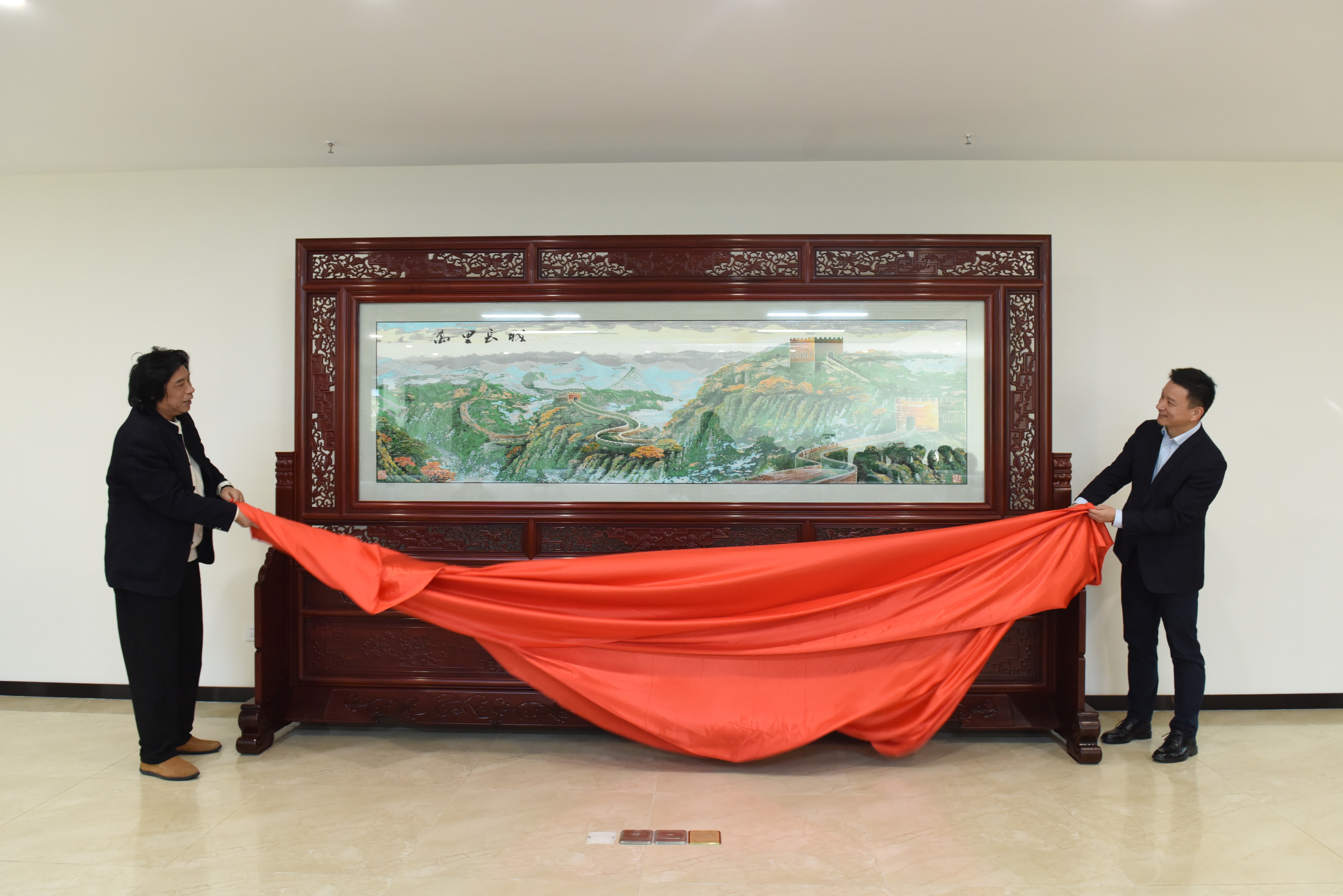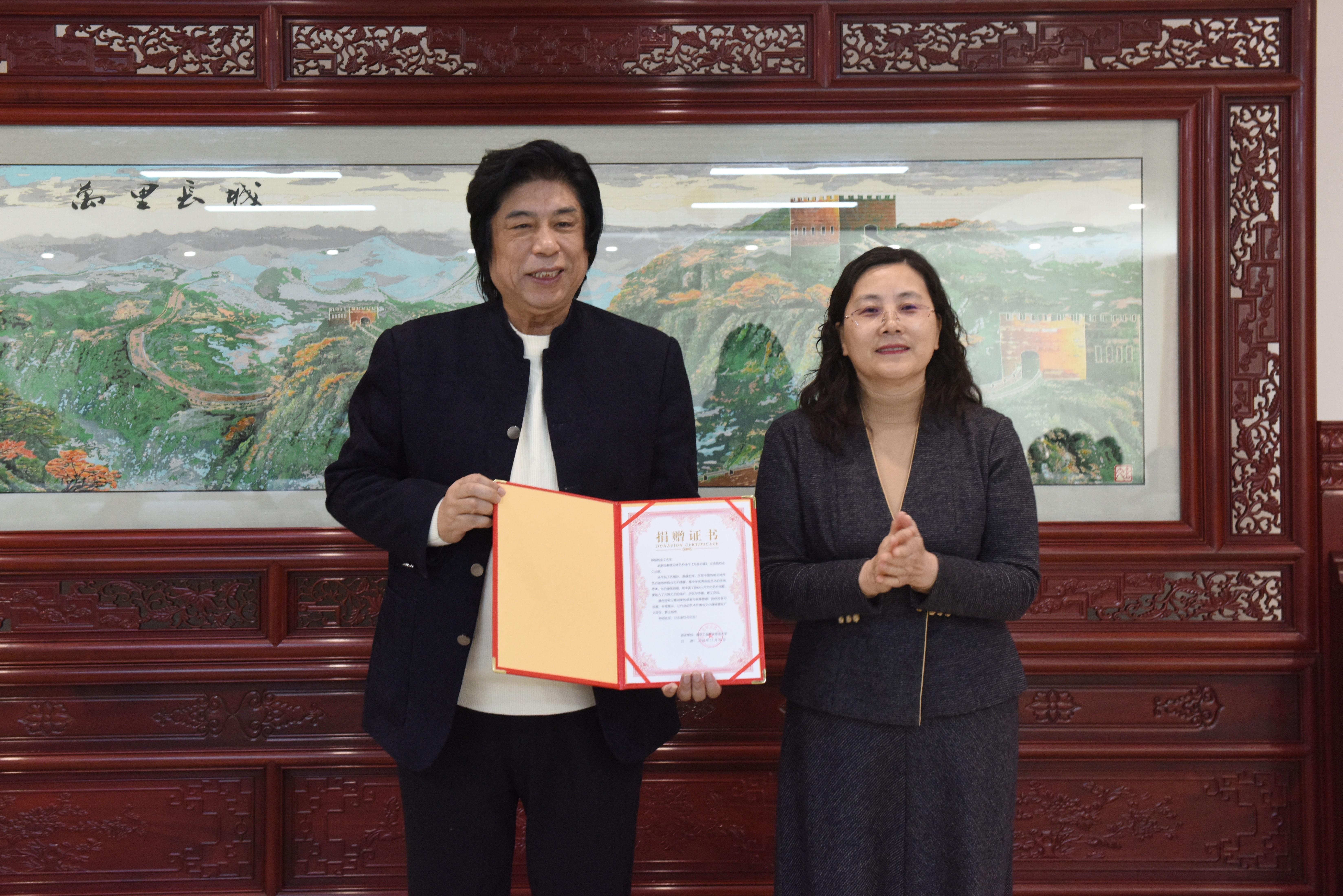 在热烈的掌声中,谢永华与金文大师共同为捐赠作品《万里长城》揭幕。这幅云锦巨作具有珍贵的收藏价值,为永恒铭记这份情谊与信任,魏萍代表学校向金文大师颁发了收藏证书,以此见证这一跨越技艺与教育、联结传统与现代的珍贵时刻。
