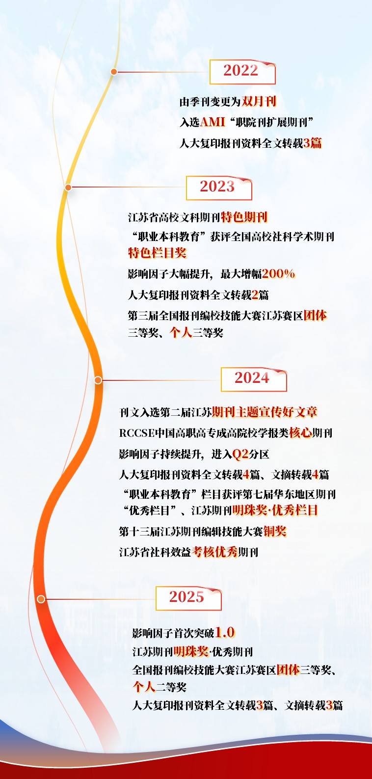 跬步千里,积健为雄。我校期刊聚焦行业重点难点,加大选题策划力度,采取专题化办刊策略,出版了一系列优秀专题,发表了一批优秀成果,期刊学术影响力和竞争力显著提升。期刊先后入选中国职业高等院校期刊AMI综合评价“职院刊扩展期刊”、2023年度RCCSE中国高职高专成高院校学报类核心期刊,并获江苏期刊明珠奖·优秀期刊、江苏省高校“特色期刊”称号。“职业本科教育”栏目先后获评第七届全国高校社科学术期刊质量与评估的“特色栏目”、第七届华东地区期刊“优秀栏目”、江苏期刊明珠奖•优秀栏目等。