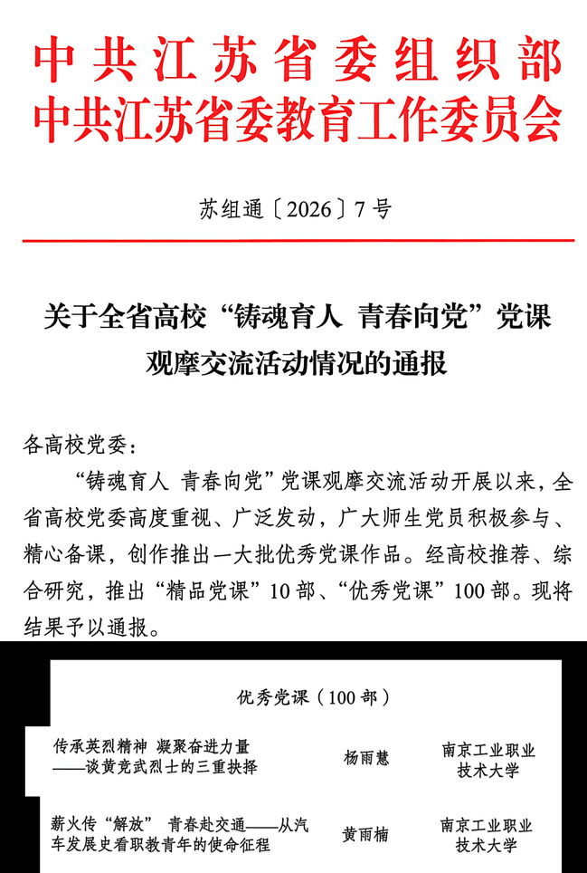 近日,中共江苏省委组织部、中共江苏省委教育工作委员会联合印发《关于全省高校“铸魂育人 青春向党”党课观摩交流活动情况的通报》,我校机关与直属单位党委组教党支部书记杨雨慧的党课作品《传承英烈精神 凝聚奋进力量——谈黄竞武烈士的三重抉择》和交通工程学院师生第二党支部副书记黄雨楠的党课作品《薪火传“解放” 青春赴交通——从汽车发展史看职教青年的使命征程》成功入选全省高校“优秀党课”。