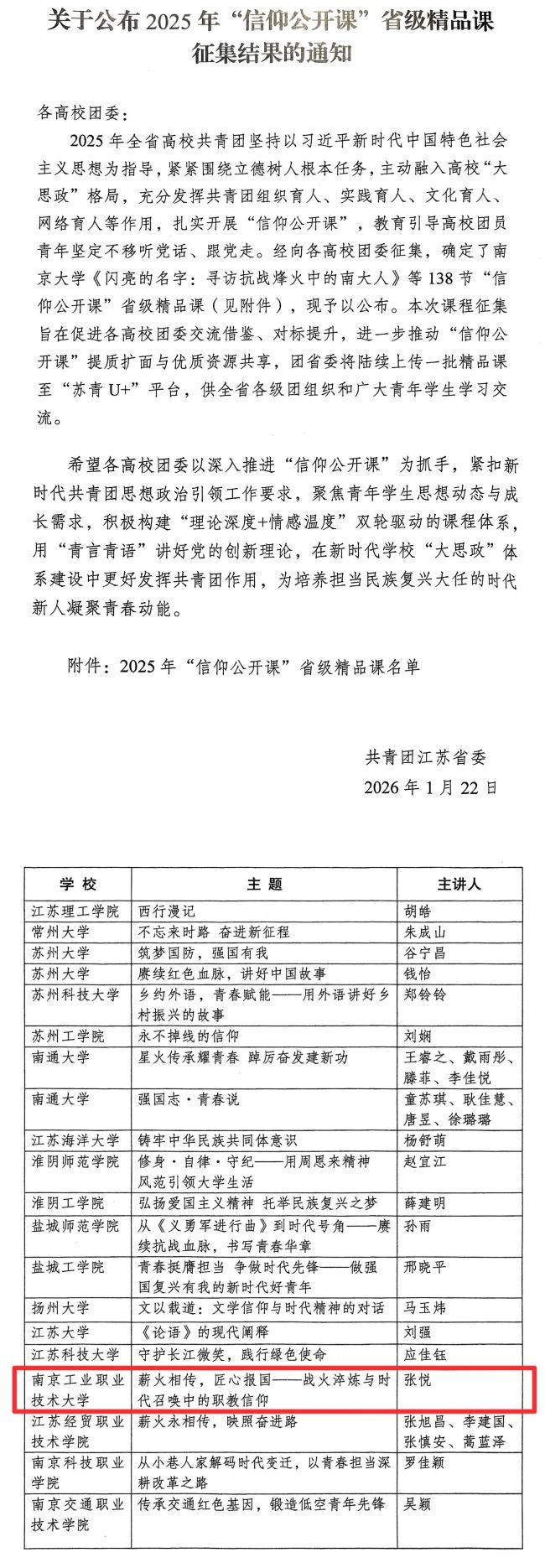 近日,共青团江苏省委正式发布了《关于公布2025年“信仰公开课”省级精品课征集结果的通知》,经高校推荐、团省委评选,在全省范围内共评选出138门“信仰公开课”入选“省级精品课”,由我校团委和电子信息工程学院/集成电路学院选送的《薪火相传,匠心报国——战火淬炼与时代召唤中的职教信仰》成功获评“省级精品课”。