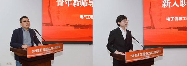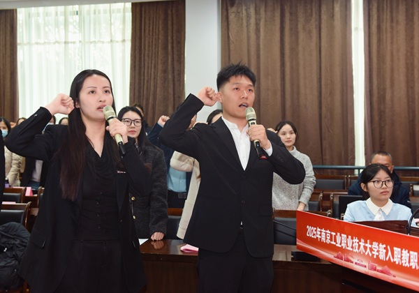 新入职教师代表杨子昂、陈家俊带领全体新入职教职工入职宣誓。青年导师杨超和新教师徐真真博士作为代表分别发言。杨超结合自身十年磨砺与从企业工程师到南工教师的转型之路,分享育人感悟。他表示将倾力帮扶青年教师成长,勉励新教师勇于突破“舒适区”,实现与学校发展同频共振。徐真真分享了从产业研发转身回归学术研究再到投身职教的选择,感谢学校的培育与支持,表达了与学校共成长的信心。