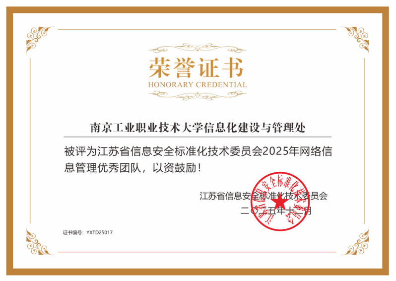 近日,江苏省信息安全标准化技术委员会表彰了2025年度在网络信息管理工作中表现突出的团队。我校信息化建设与管理处获评“2025年网络信息管理优秀团队”。