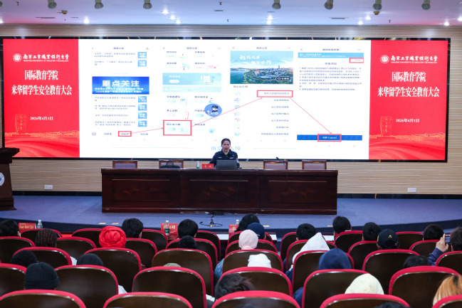 为切实保障来华留学生在校学习、生活安全,强化留学生法治意识与安全防范能力,4月1日下午,国际教育学院联合栖霞公安分局召开2026年来华留学生安全教育大会。栖霞公安分局四级高级警长林海峰、警官王天,国际教育学院、伦敦南岸学院直属党支部副书记、副院长张莉及国际教育学院教师、全体来华留学生共同参会。