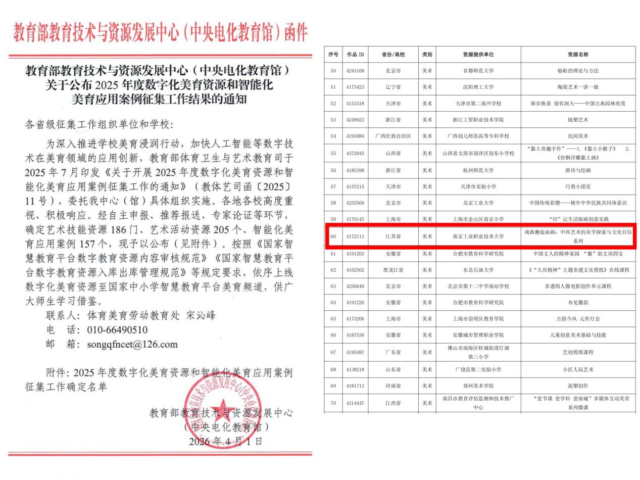 近日,教育部公布2025年度数字化美育资源和智能化美育应用案例征集工作结果,我校艺术设计学院教师殷群的艺术技能资源课程《戏曲邂逅油画:中西艺术的美学探索与文化自信系列》成功入选。据悉,全省各级各类学校共30项成果入选,其中9所高校入围。根据《国家智慧教育平台数字教育资源内容审核规范》《国家智慧教育平台数字教育资源入库出库管理规范》等要求,相关数字化美育资源将依序上线国家中小学智慧教育平台美育频道,供广大师生学习借鉴。