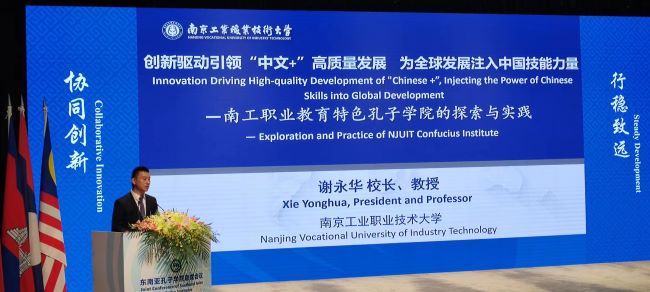 在联席会全会上,谢永华做题为《创新驱动引领“中文+”高质量发展,为全球发展注入中国技能力量——南工职业教育特色孔子学院的探索与实践》的主旨报告。他介绍了我校国际合作与交流总体情况以及我校推动职业教育特色孔子学院高质量办学的探索与实践经验。他指出,国际中文教育与职业技能融合已成为重要发展趋势。我校共建的柬华理工大学孔子学院开展两国共同认证的旅游管理、物流管理、电子商务、计算机网络技术等本科“双学历生培养”,从办学形式、教学组织和课程设置等方面,创新人才培养模式,强化校企合作,为柬埔寨培养本土化技术技能人才,推动中国职业教育教学标准走向世界,为“职教出海”提供了新发展路径。